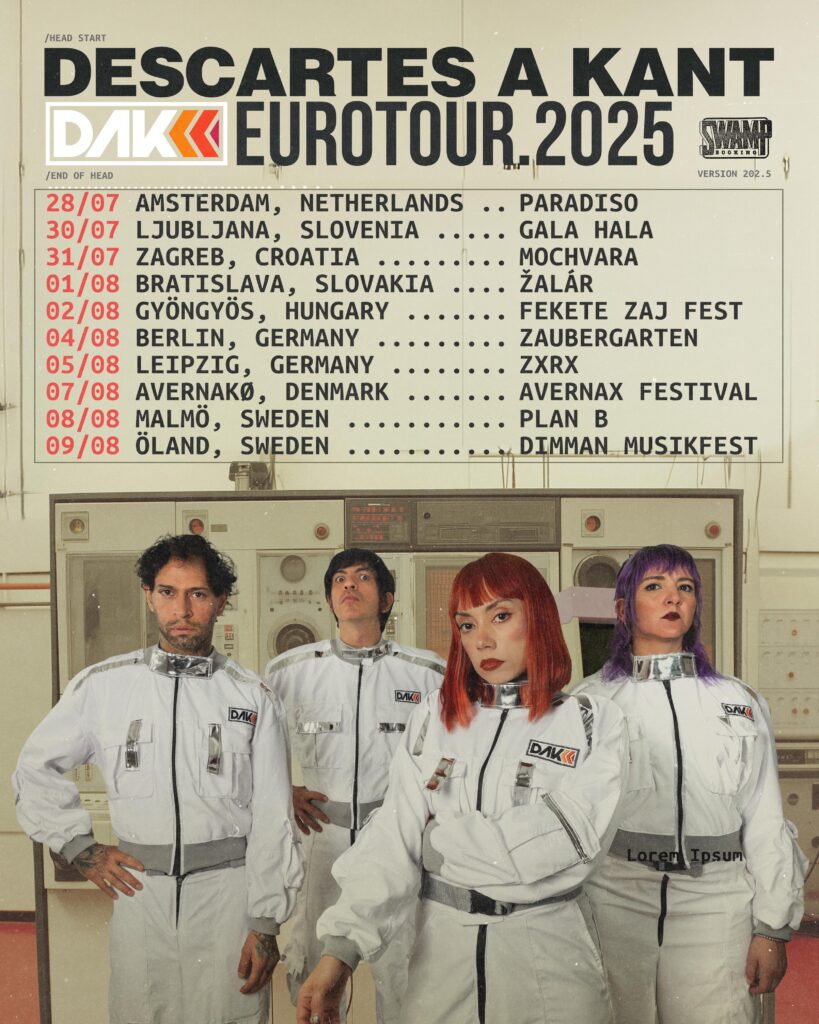 CDMX, 28-Jul-2025 – Una de las bandas más innovadoras de la escena alternativa mexicana ha despegado rumbo a Europa. Con una propuesta tan caótica como precisa, Descartes a Kant arranca hoy su Eurotour 2025, una travesía musical que llevará su característico art-punk por nueve ciudades del viejo continente, prometiendo dejar una huella imborrable con su energía desenfrenada y su teatralidad visceral.