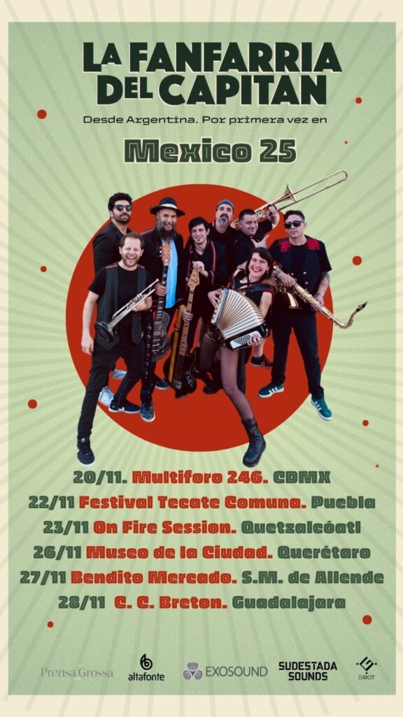 CDMX, 11-Nov-2025 – Después de recorrer escenarios de Europa y Sudamérica, la alegría y energía de La Fanfarria del Capitán desembarcan en México. La banda argentina, reconocida por su estilo único que combina ska, rock y cumbia, llega por primera vez al país con una gira que promete encender los escenarios de CDMX, Puebla, Querétaro, San Miguel de Allende y Guadalajara.